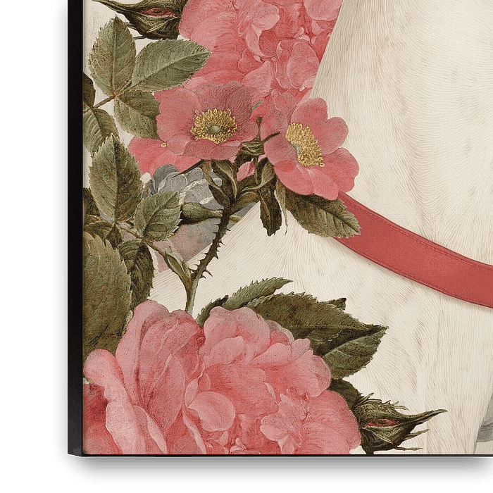 The style of the artwork combines a classic, realistic dog portrait with botanical illustration styles, resulting in a striking and elegant piece suitable for interior decoration. The image shows the…