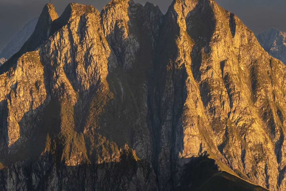 The last rays of the sun bathe the majestic Höfats in the Allgäu Alps in a warm, golden light. The rugged peaks, crowned by a light blanket of snow, rise proudly into the sky. The deep valleys are bathed in a soft violet colour, while the meadows on the valley floor still catch the last light of the day.