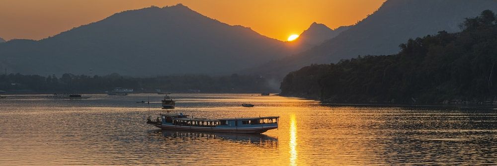 As dusk falls over the majestic Mekong River in Luang Prabang, a breathtaking panorama unfolds, enchanting the senses. The sky, drenched in warm colours, is dominated by a glowing orange ball that slowly disappears behind the mountains. The clouds dance in various shades of pink and purple as the sun breathes its last in the daylight.