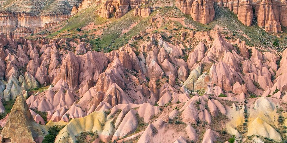 This impressive photo shows the world-famous landscape of Cappadocia, located in central Turkey. The extraordinary rock formations, known as fairy chimneys, were created by centuries of erosion and together form a fairytale-like and almost otherworldly setting. With their jagged shapes, colourful rock layers and the vast valleys in the background, this picture exudes both power and tranquillity.