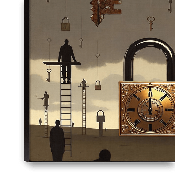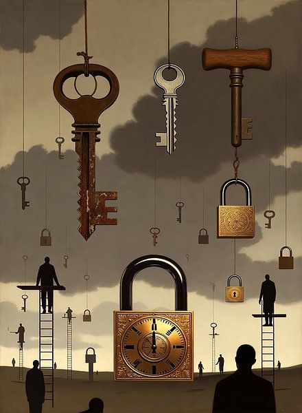 A surreal creation with the keys and padlocks of time that can open up a very subjective vision. The palette, with its shades of gold, black and grey, invites contemplation and the potential of time to be explored.