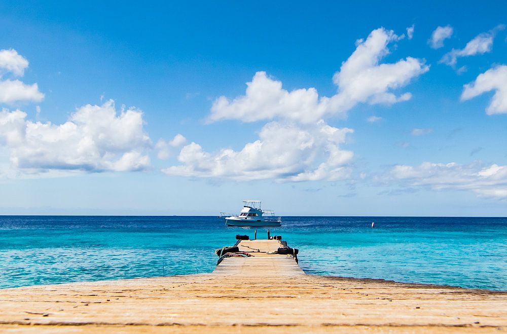 view from the pier at playa Kalki in west point. One of the most beautiful beaches of Curacao. Beautiful blue water and white sand. Very nice.