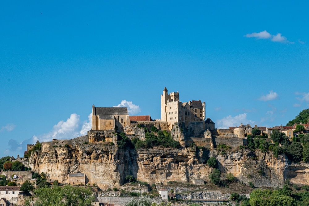 The Chateau de Beynac towers over the town of Beynac which clings to the rocks in a bend of the Dordogne river, France