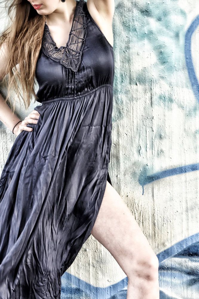 Blond woman in pose in front of a blue graffiti. It is reminiscent of the sea.