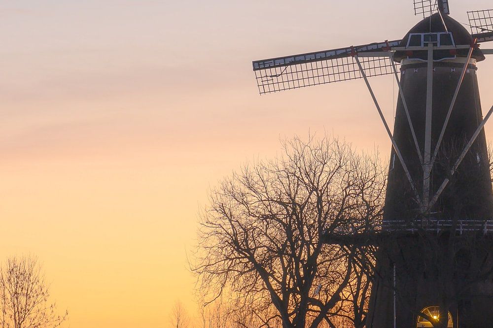 Winter landscape in Buren, Gelderland, where the mill the Prince of Orange stands in the snowy meadows, under a beautiful orange sky because of the almost rising sun