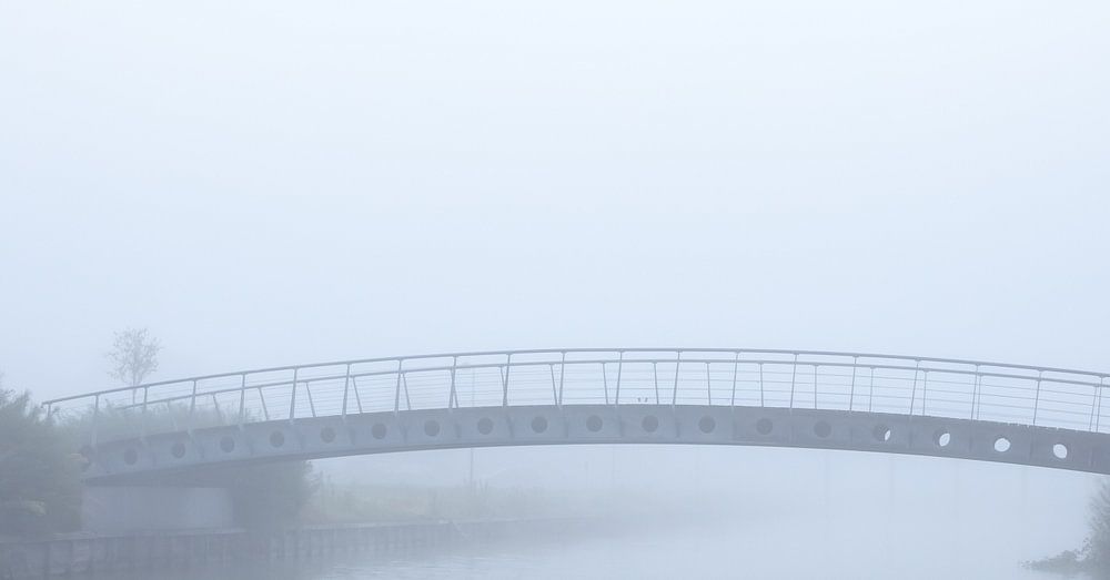 On a thick foggy morning along the water's edge, there's a footbridge or bicycle bridge...