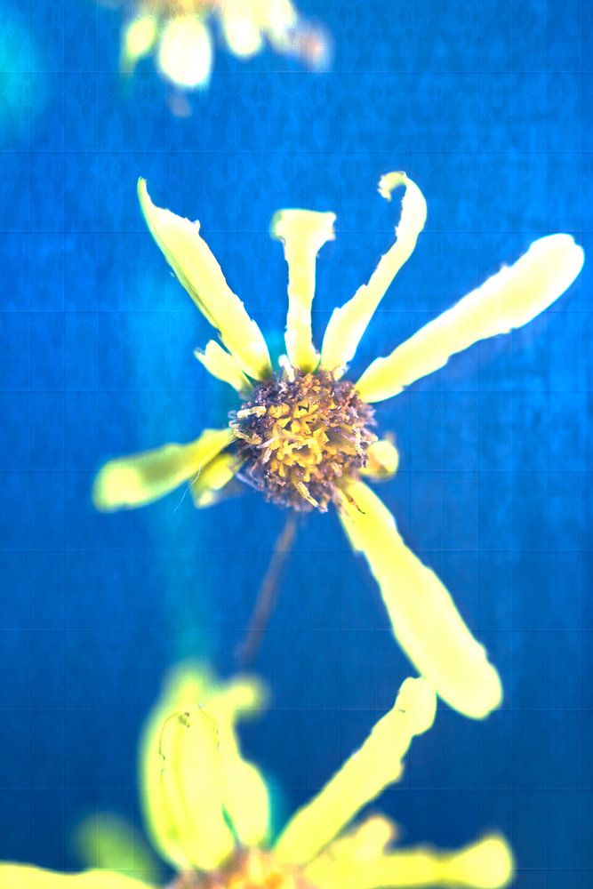 A macro picture of three yellow flowers at the end of their life cycle on a blue fantasy background.