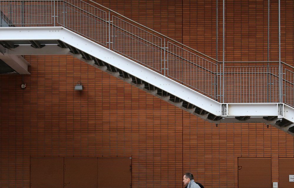 deze trap die buitenlangs he KPN gebouw in Rotterdam loopt trok mijn aandacht van wege de diagonaal tussen de verticaal lopende pilaren . door de wandelaars op te nemen in deze foto zien we de verhouding van deze constructie