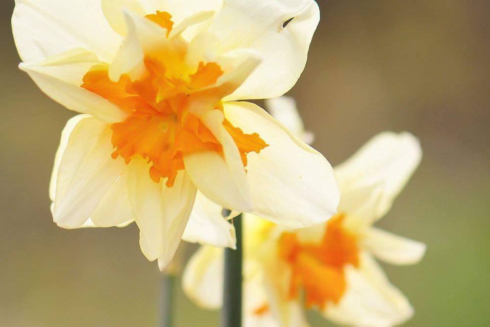 soft macro of two white-yellow daffodils growing in the forest in the wild