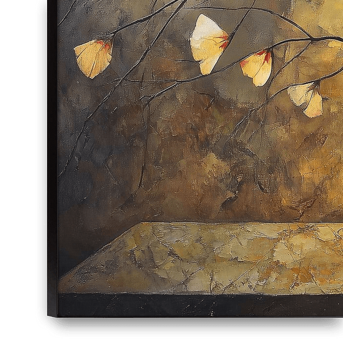 vase flowers - This flower painting shows a modern still life with a round stone vase full of slender dark branches and fan-shaped, warm orange-red and cream-coloured petals shining forward like sunlight against a golden yellow, tanned background, perfect as a flower painting or painting flowers for a modern interior.