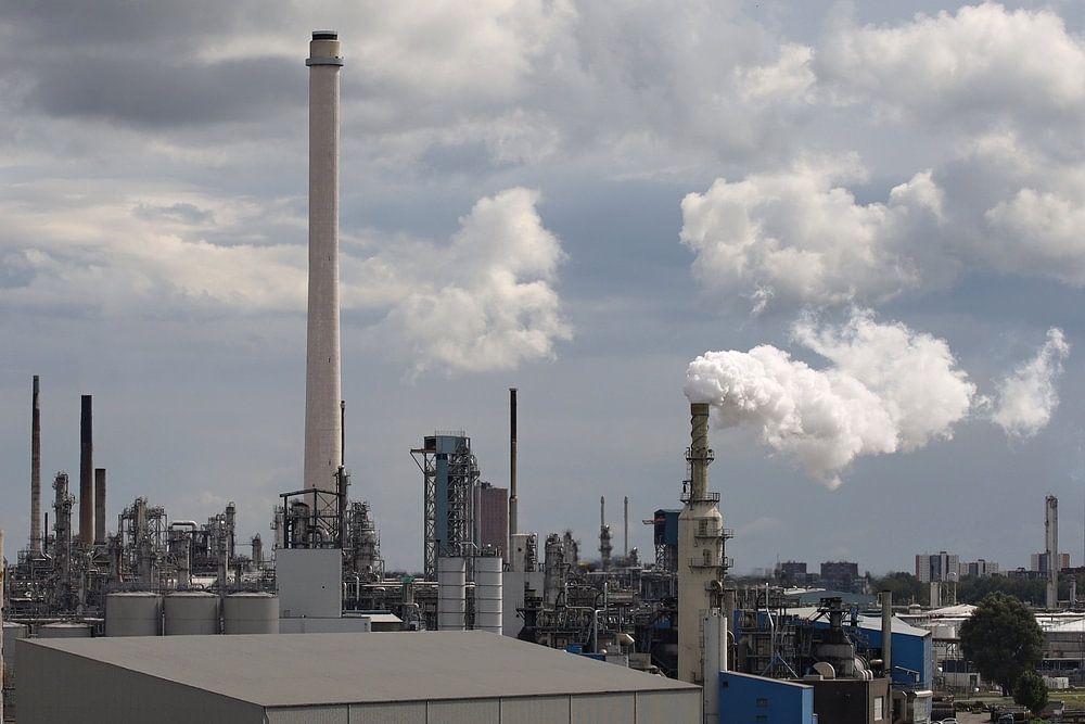 view of an industrial estate with chimney smoke