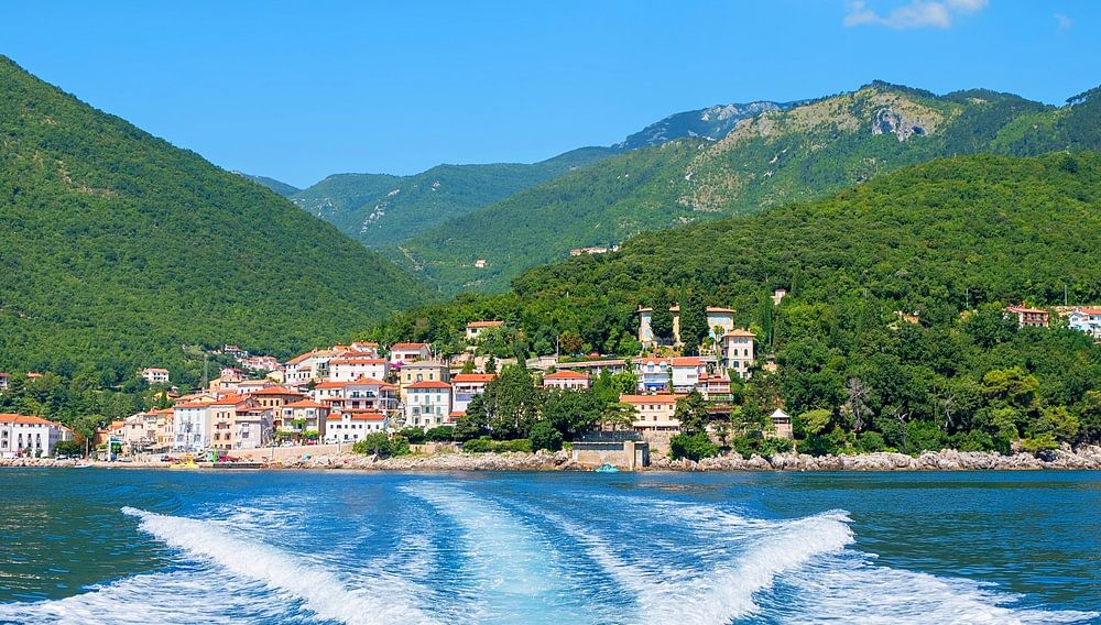 view to coastline of moscenicka draga, boat trip at the ocean. kvarner bay croatia in summer