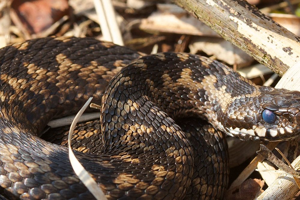 Viper photographed in Haaksbergerveen (Overijssel). The blue curtain over the eyes indicates that he will molt soon. Shortly after mating takes place.
