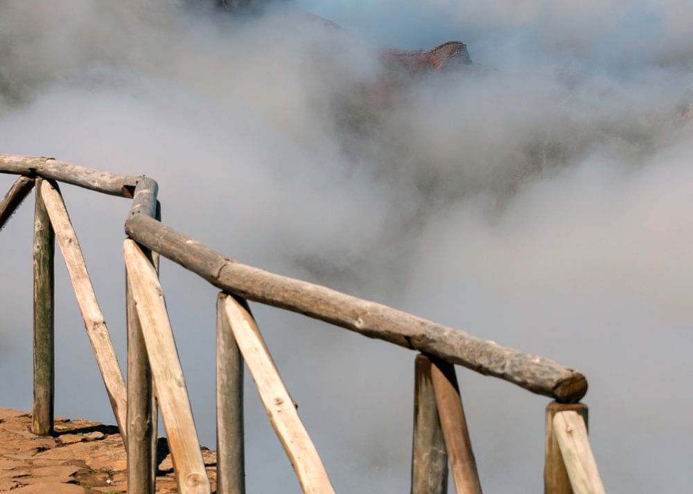 walkway with wooden railings at a great height at mountains at madeira island called pico arieiro, the top is 1818 meters above sea level