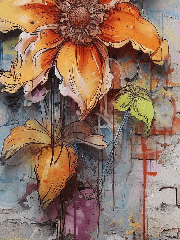 A bright orange flower, surrounded by delicate yellow and purple accents, blossoms on a rough wall of bricks and plastered surfaces. The graffiti art mixes organic shapes with urban textures, with splashes of colour and lines creating a dynamic energy. Real green leaves sprout from the bottom edge and interact with the painted nature. The contrast between the ephemeral beauty of the flower and the permanence of the wall creates a poetic tension. It is a dialogue between decay and new life, captured in an urban canvas.