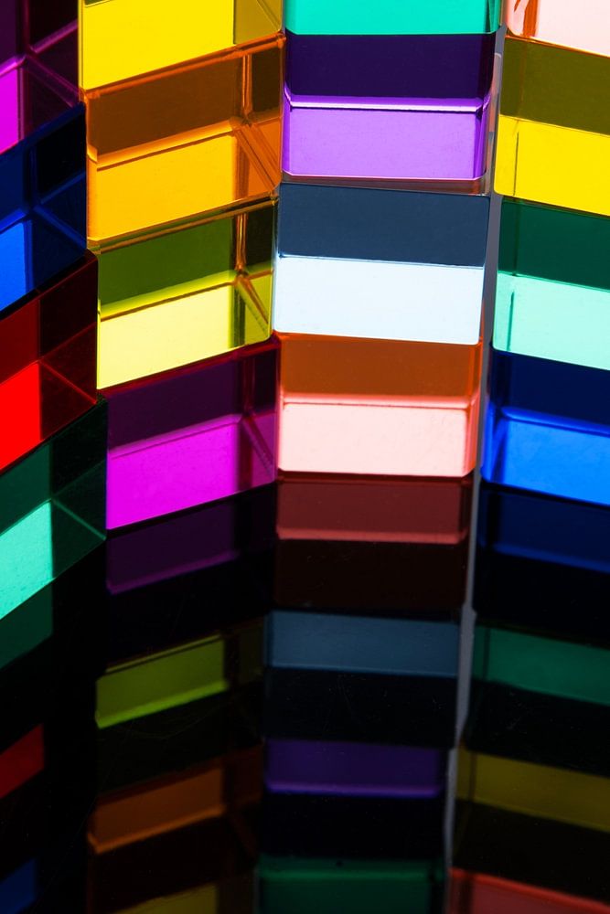 A wall of glass multicoloured cubes, on a high-gloss background, with a green cube in the bottom right corner as a counterpart.