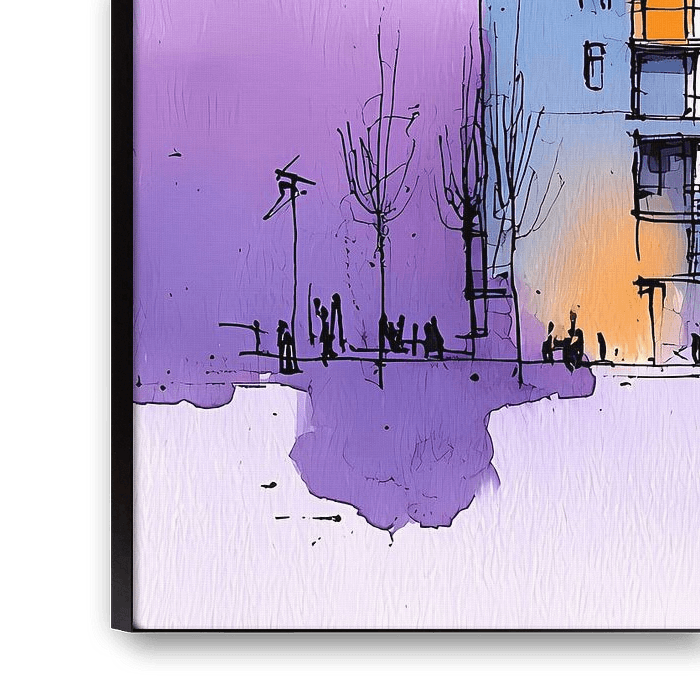 watercolor architectural sketch of modern apartment buildings in town, people and public transport