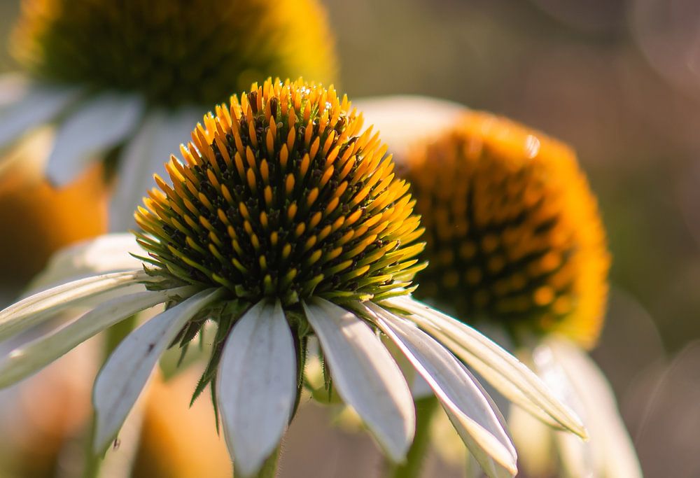 Close up of white echinacea flowers with sunlight in the background, which gives a nice bokeh effect.