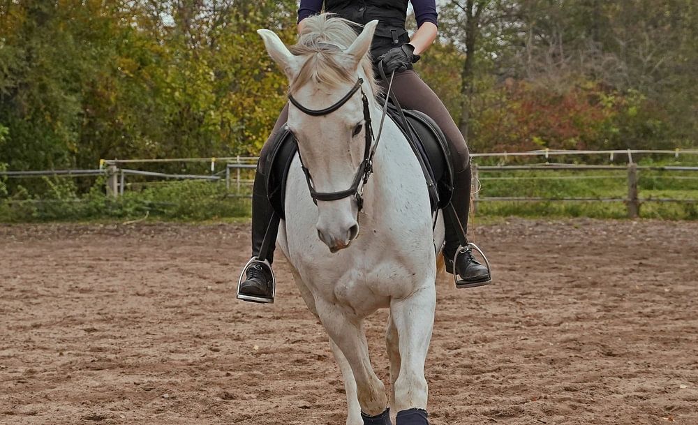 white horse and rider training on a riding arena by Babetts Bildergalerie
