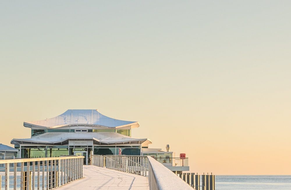 The beautiful , white bridge house on the pier of Timmendorfer Strand , is a gem for hospitality and coziness .