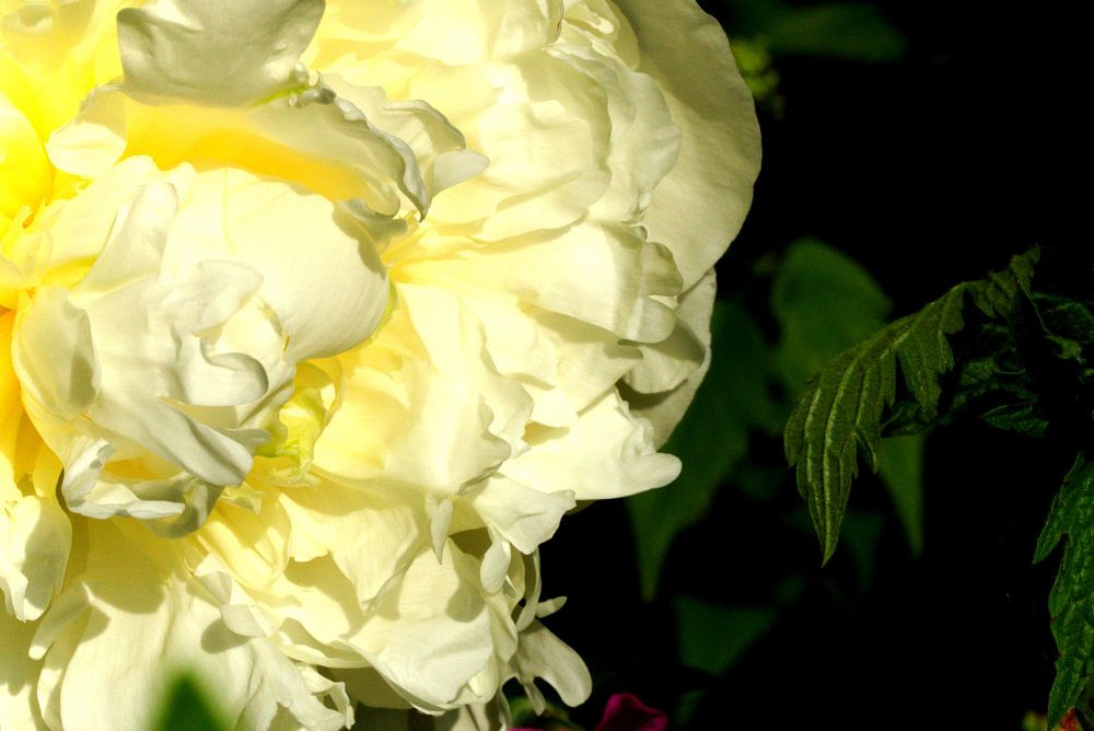 The white peony looks like whipped cream so creamy is the white color. Here in combination with the wild geranium it gives a nice picture.