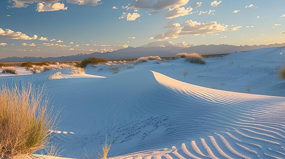 A photo of the White Sands National Monument shows a breathtaking landscape of endless, gently rolling dunes of pure white sand. The brilliant sun casts brilliant shadows across the sand, while the sky is a deep blue. The contrast between the bright white sand and the intensely blue sky creates an enchanting display of colours. The image evokes a sense of serenity and wonder, where time seems to stand still amidst this natural splendour.