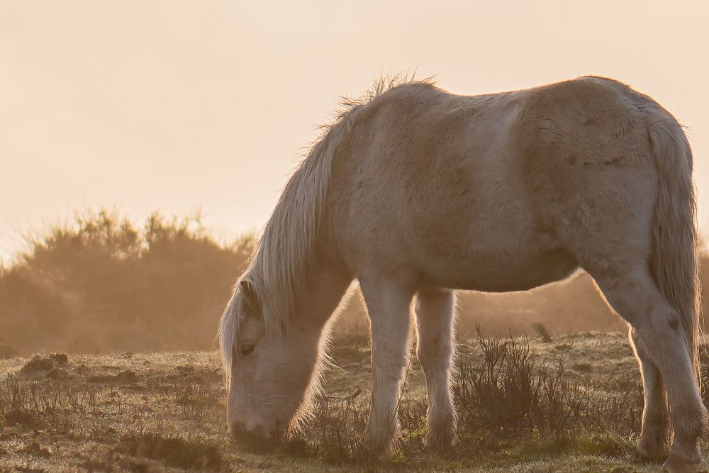 a white wild horse, grazing on the moors of the Posbank, in the golden light of sunrise, on a cold autumn day.