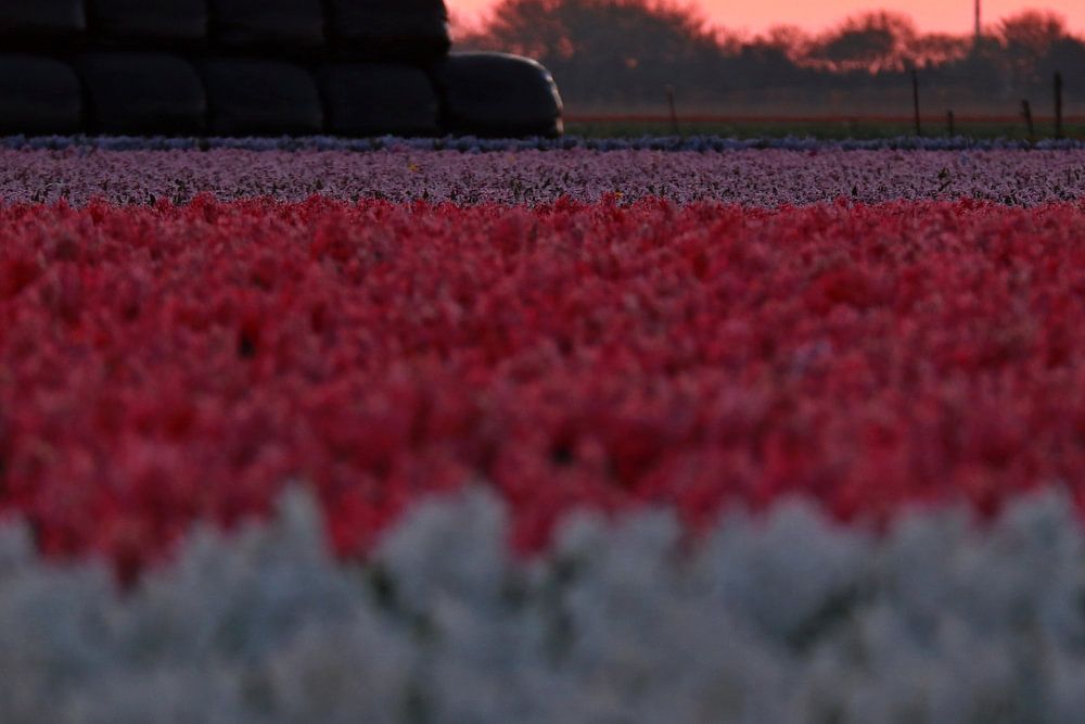 windmolen bij zonsopgang met hyacinten op de voorgrond