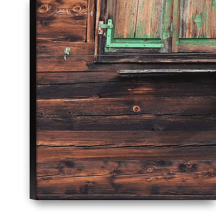 Swiss dark wooden chalet with window and old weathered green shutters