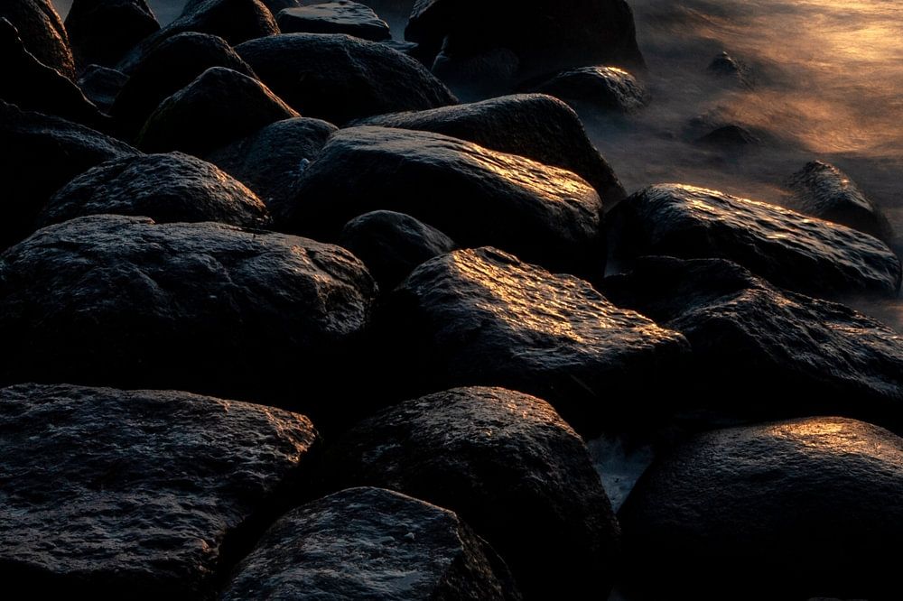 . The water surface is calm and calm, sloshing over the stones making the reflection of the sun look like gold. The colours in the photo are bright and vibrant, with a warm hue of gold and orange from the sunrise slowly transitioning into the soft tones of the cold lake. All in all, it is a beautiful photo that manages to capture the peace and serenity of the morning.