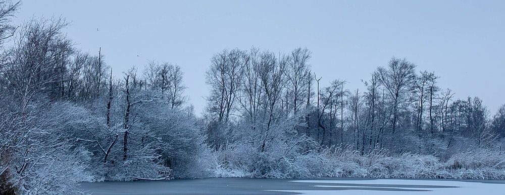 landscape photo of a snowy lake. around the lake are snowy trees.