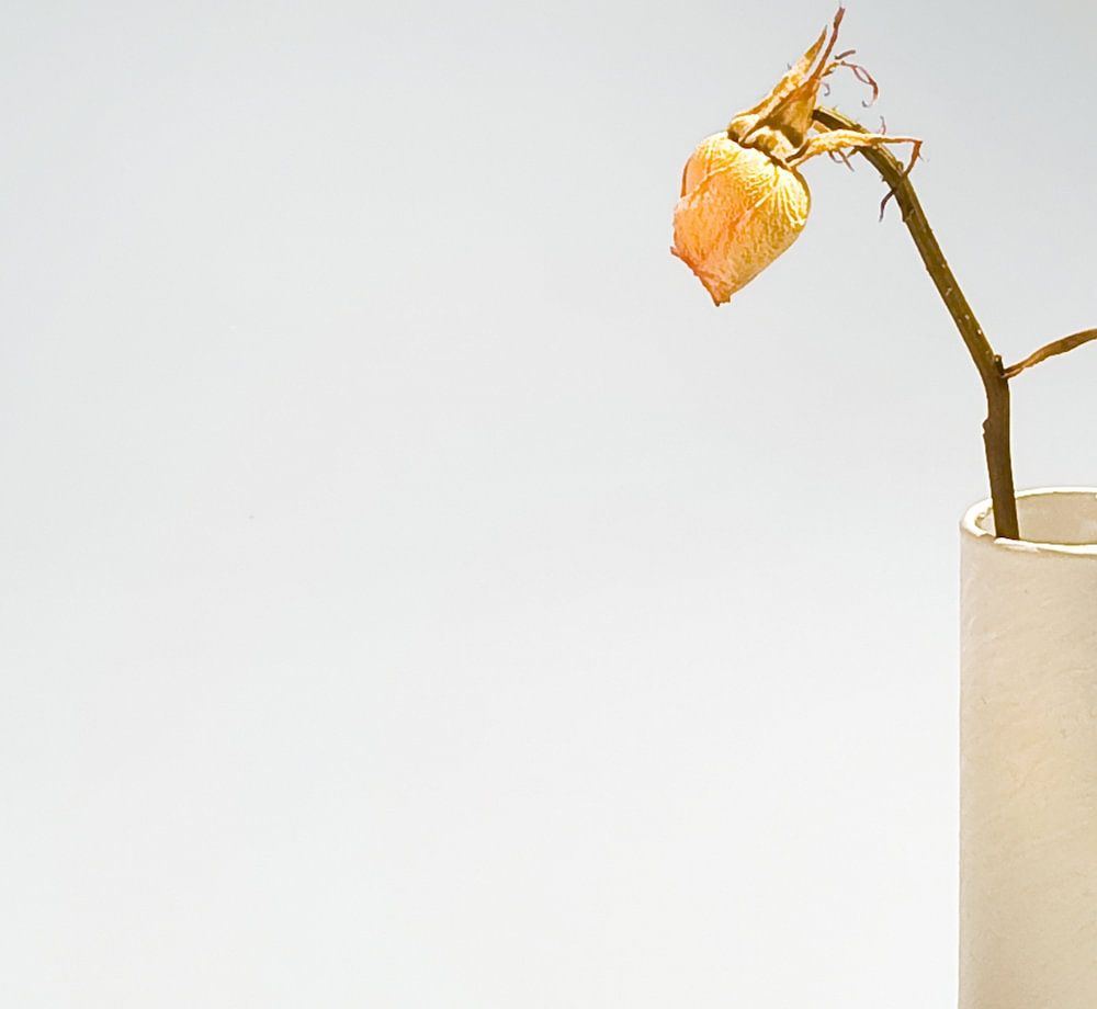 Still life with a dried rose and a fallen petal on a light background. Minimalism.