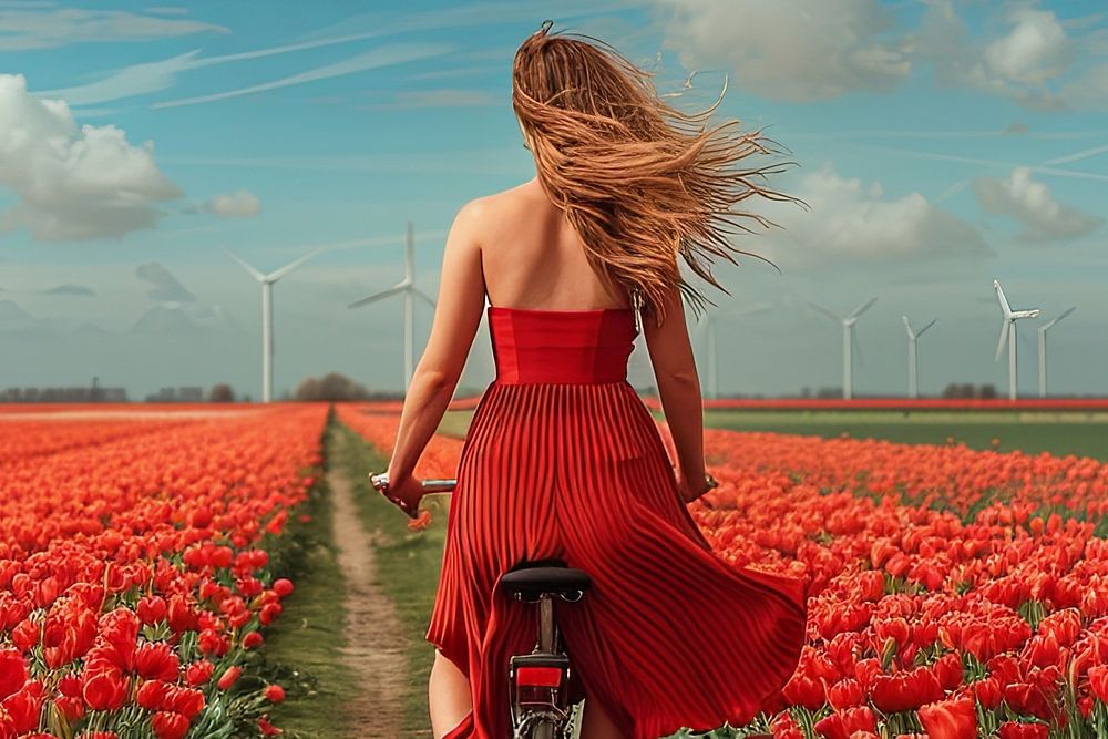 woman in red dress cycles through a tulip field in a typical Dutch landscape