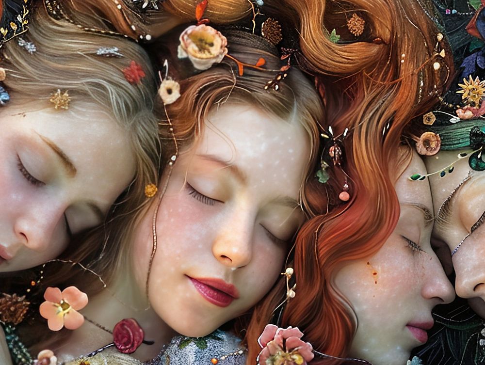 women together with eyes closed in picturesque style with flowers and stars in romantic image