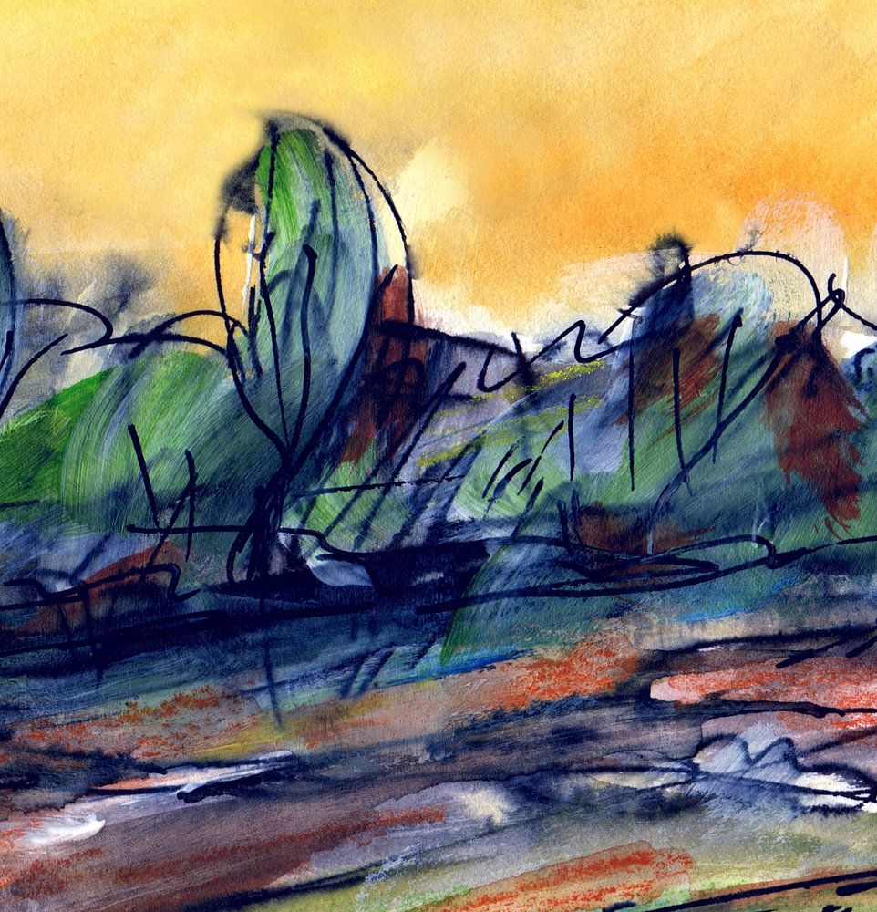 Buy this landscape artwork yellow sky by Claudia Gründler on canvas, ArtFrame, poster and wallpaper, printed on demand in high quality.