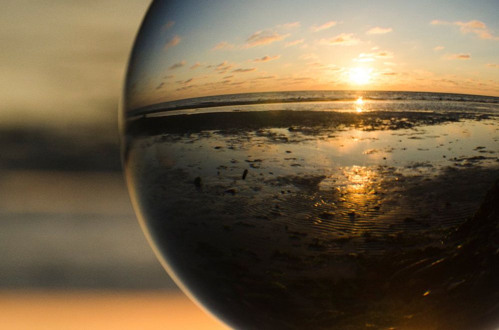 zonsondergang gezien door een glazen bol aan het strand bij Noordzee aan de brouwersdam