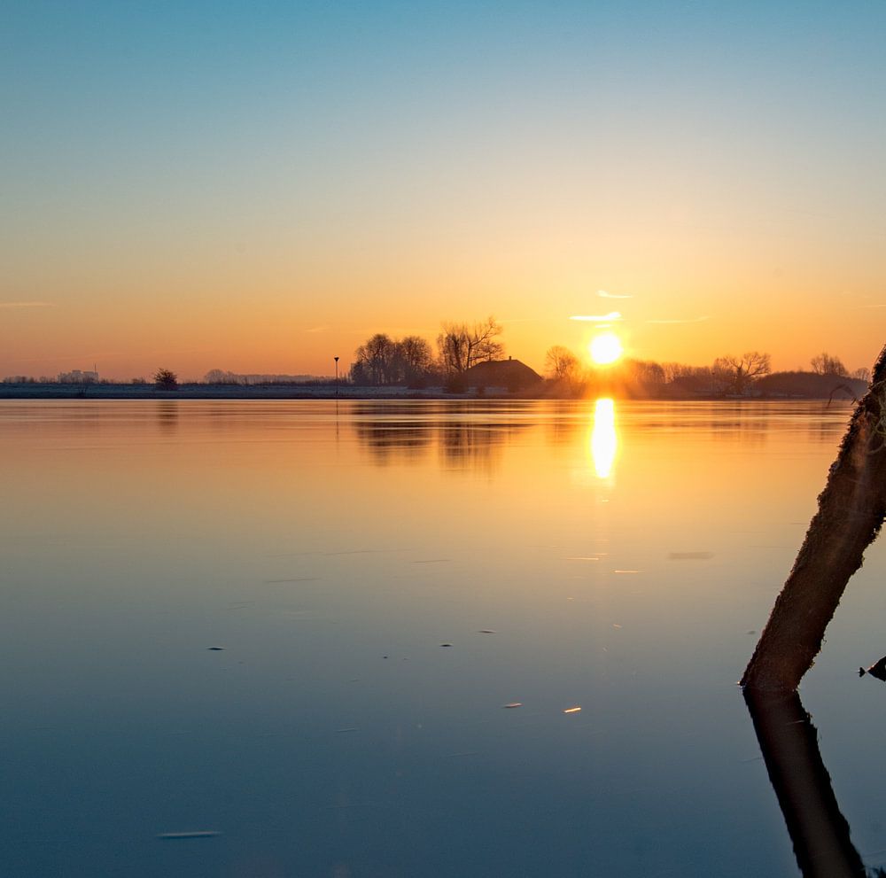 zonsopgang boven de IJssel op een koude ochtend. de IJssel lijkt een spiegel en geeft mooie reflecties