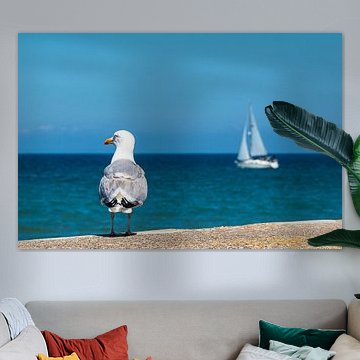 Seagull and sailboat on the Baltic coast in Warnemünde by Rico Ködder