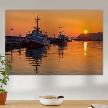 Sunset and fishing boats in the harbour of the town of Sassnitz on by Rico Ködder