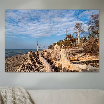 Steep coast with beach, stones and waves under a dark cloudy sky at the Baltic Sea in Mecklenburg-We by Maren Winter