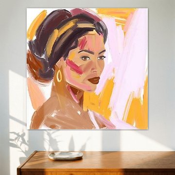The terracotta, bronze, and taupe tones in Colourful, modern and abstract portrait pair beautifully with natural materials like rattan chairs, wooden counters, or linen cushions. These earthy combinations create a welcoming, grounded feel in your salon. Add greenery or ceramic accents to complete the look.