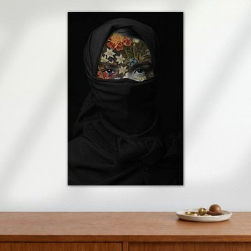 Ornate colorful flowers in Delft blue vase by INKR ART