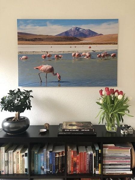 Wide, expansive scenes feel most natural when hung at standing eye level - roughly 145 - 155 cm from the floor to the centre of the artwork. This placement invites you into the view without straining your neck. Position Volcano hike in Chile with view of the Laguna Verde at the foot of Licancabur above a sofa or sideboard to anchor the space and draw the eye outward.