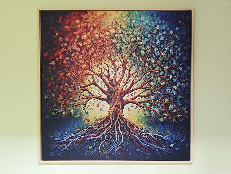 Neutral walls let subtle artwork colors shine without competing for attention. The muted gold and blue tones in Soul tree complement both cool grey and warm cream interiors. If your room already features bold colors, choose an artwork with softer hues to create visual balance rather than contrast.