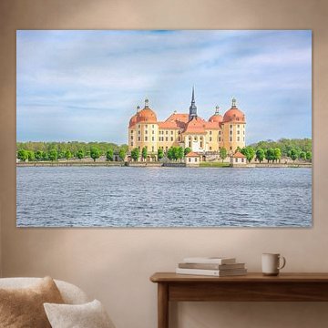 Landscape format is the dominant choice for castle artworks, and for good reason. The horizontal orientation captures the full span of these impressive structures, from turrets to surrounding landscapes. This format works well above a sofa, sideboard, or bed, where the width draws the eye across the wall. That said, portrait format suits narrower walls beautifully - think hallways or the space beside a doorway, where Slot Moritzburg's vertical lines create calm and height.