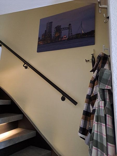 Cityscapes with architectural detail work best when hung at comfortable viewing height - around 145 - 155 cm from the floor to the center of the artwork. Waterfront scenes with reflections, like Rotterdam skyline, reveal their full detail when you can take in both skyline and water at a natural sightline.
