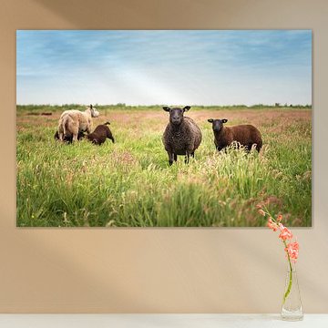 Sheep with drinking lambs in the meadow by Pieter Struiksma