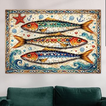 Fishing art captures both the beauty of marine life and the surreal possibilities of water worlds. From underwater schools of fish to whimsical, dreamlike compositions, these artworks bring calm and mystery into your space. The color palettes - deep teals, vibrant oranges, and soft mauves - work beautifully in contemporary and eclectic interiors, while pieces like Spinning swirl fish add dynamic movement to any wall.
