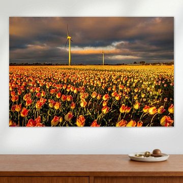 orange sun over red tulip field by peterheinspictures
