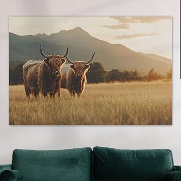 Want to buy majestic highland cow paintings, wallpaper, or photo art? The highland cow wall art collection can be printed in several high-quality materials. Think of metal, aluminium, glass, or canvas. Create calmness in the room with wallpaper from a photo of a highland cow in nature. Or buy a robust highland cow portrait on metal. There is highland cow wall art available for every style and interior.